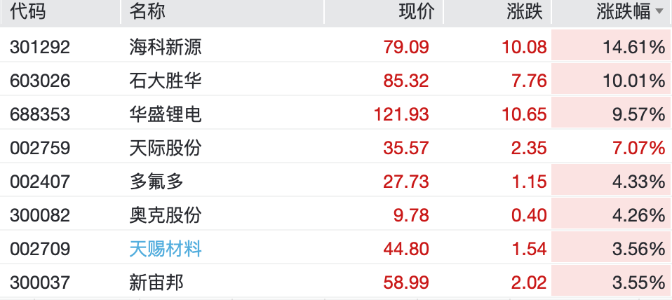 从板块来看,锂电产业链逆势大涨,其中锂电电解液概念股集体狂飙,海科新源涨超14%领涨,石大胜华涨停,华盛锂能、天际股份、多氟多等多只概念股跟涨。